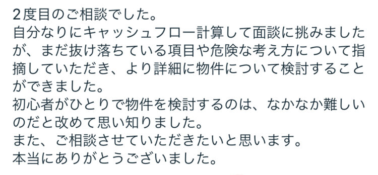 ※最初に物件の探し方や条件をお伝えして物件を探していただき、良さそうな物件が見つかったら私が診断して、考え方や判断をお伝えしていく流れです。